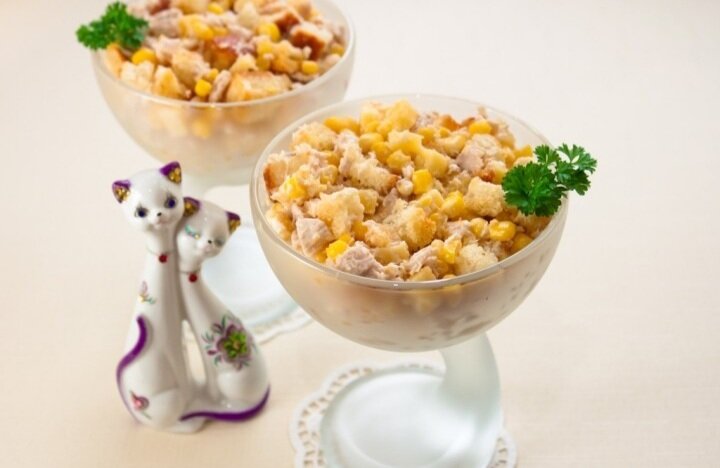 Смешать филе, сыр, кукурузу, сухарики (сухарики рекомендую добавлять перед подачей на стол, чтобы они оставались хрустящими).