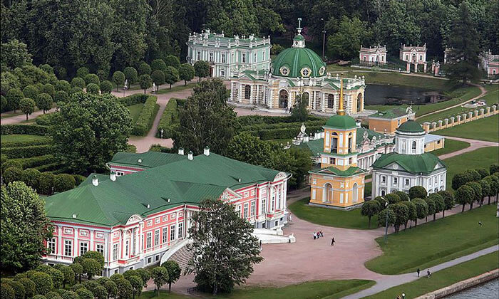 Зайдя на территорию усадьбы через главные ворота, вы проходите вдоль Большого пруда, куда в былые времена заплывали прогулочные суда. С другой стороны дорожки вы увидите Менажереи и Грот, и пройдёте мимо затейливо построенных бывших кухонь и серовато-белой церкви (использующейся для проведения служб два раза в месяц), её украшает статуя архангела Михаила. Находящаяся по соседству золотисто-жёлтая колокольня построена по образцу здания Адмиралтейства в Санкт-Петербурге как знак восхищения перед его основателем Петром Великим.