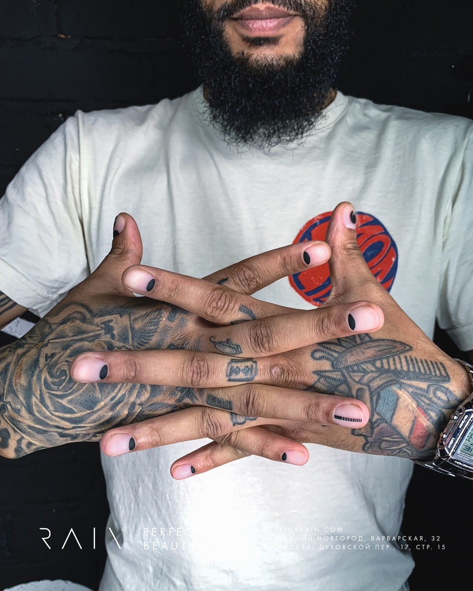 Мысль сделать дизайн на мужских руках сидела в моей голове три-четыре года. Тогда ещё не существовало нашей студии в Москве, а в провинциальном городе в тот момент такие эксперименты выглядели бы инородно. Нужна была харизматичная фактура и благоприятная среда. Хотелось не эпатировать, а наоборот, гармонично вписать маникюр в образ человека.