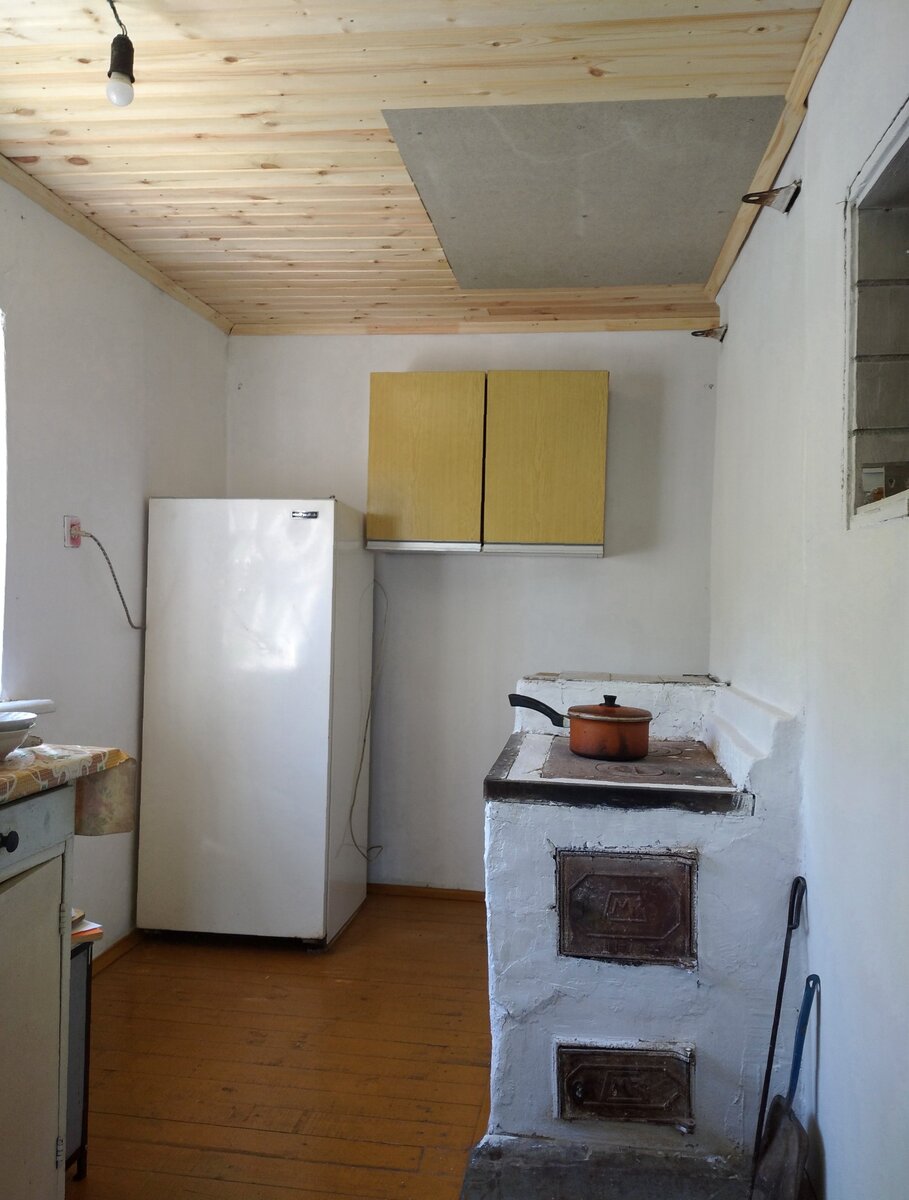 Потолок на кухне был ужасный и вот его решили зашить вагонкой. Родственники помогли привезти материал, благо магазин недалеко от сада. Взял вагонку и специальную огнеупорную плиту, которую я решил разместить над плитой. На всякий случай — иной раз плита раскаляется докрасна, когда топим печь в холодное время года. Итог работы внизу на снимках.