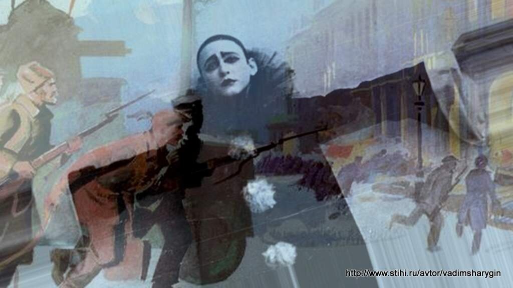 Пьеро в образе Вертинского широко раскинул руки, преграждая путь населению: «Стойте!». Но всё напрасно...