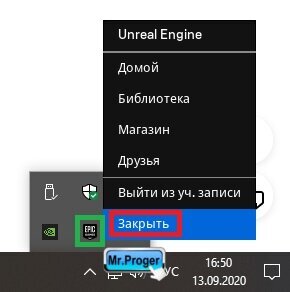 Для начала нам нужно полностью завершить Epic Games. Обычно, если активна какая либо скачка - она остаётся работать в трее. Убираем её и оттуда: