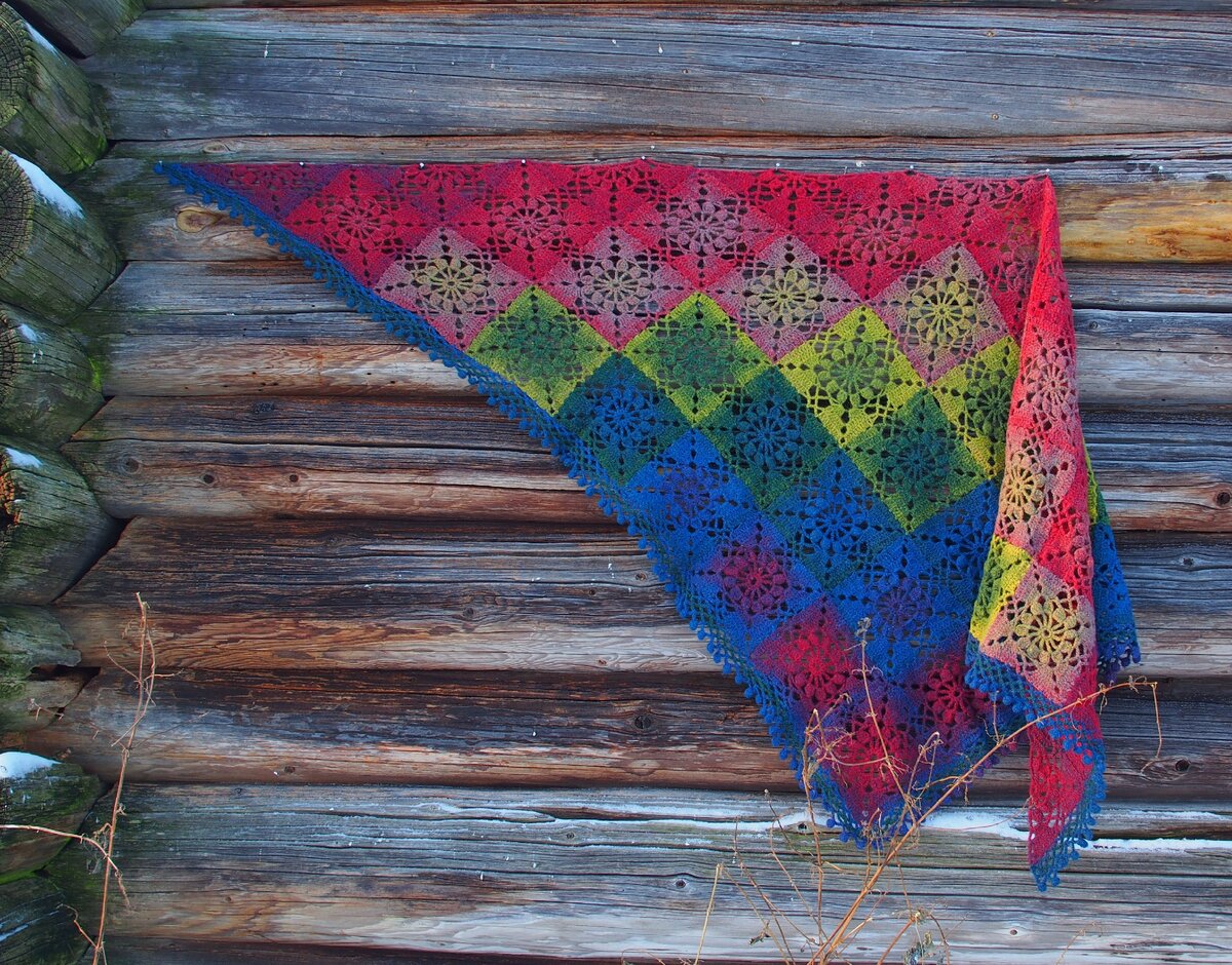 Но то ли от того, что в ту пору повсюду сверкали новогодние огни, то ли от того, что к середине зимы заскучалось без ярких красок, я смирилась и, избрав концепцию расположения мотивов, с трудом, но навязала из оставшейся пряжи нужных мне для закрытия шали квадратов и треугольников.