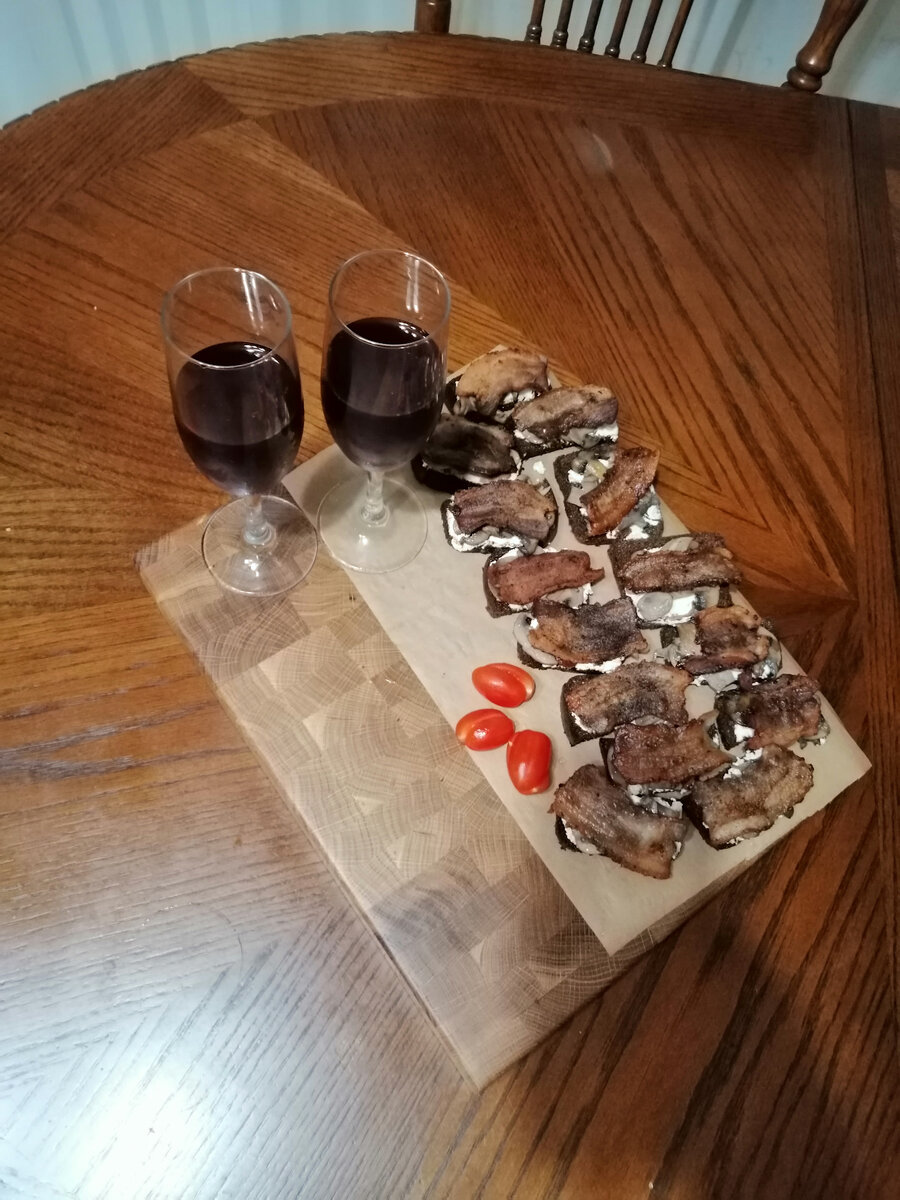 Далее берем тарелку или разделочную доску и добавляем последние штрихи к данному блюду. Первым делом обжариваем бекон на электрогриле с каждой стороны по 1-2 минутке, затем обжариваем шампиньоны а после и сам бородинский Хлеб. После выкладываем бекон на бумажные салфетки дабы стек весь жир, тоже самое проделываем с Бородинским Хлебом.