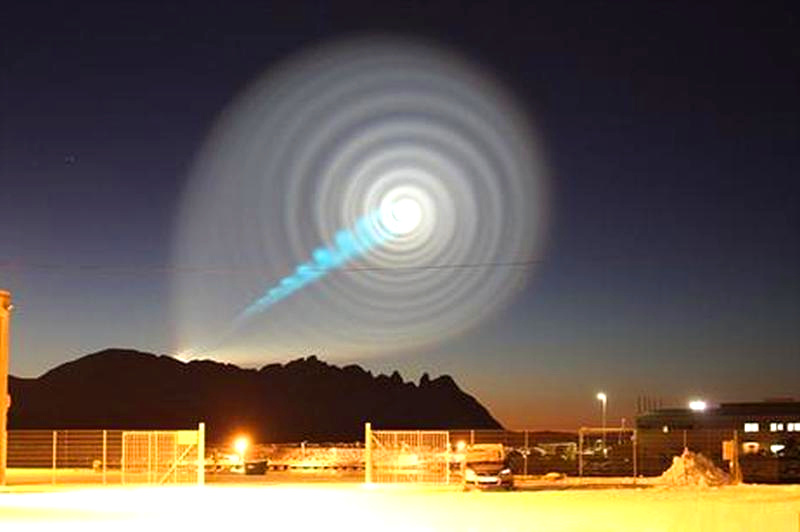 Официальное описание есть в вики. Так называемый «Случай в Норвегии 2009 года». Тогда тысячи жителей этой северной страны стали названивать в цент метрологии. Никакого зонда там не запускали. Опыты не производили. Чуть позже вышла версия о «русском следе». Официально сообщалось, что в это время в Северном море подлодка запустила ракету. 2 ступени отделились штатно, а с третьей что-то пошло не так. В итоге боеголовка просто крутилась как юла на месте, пытаясь скинуть ненужный хвост. Ну хорошо. Уговорили. Тут я поверю! Только объясните мне, что это за прожектор светит с неба на землю? Или может наоборот. Луч исходил с поверхности Земли? На всех фото это хорошо видно.