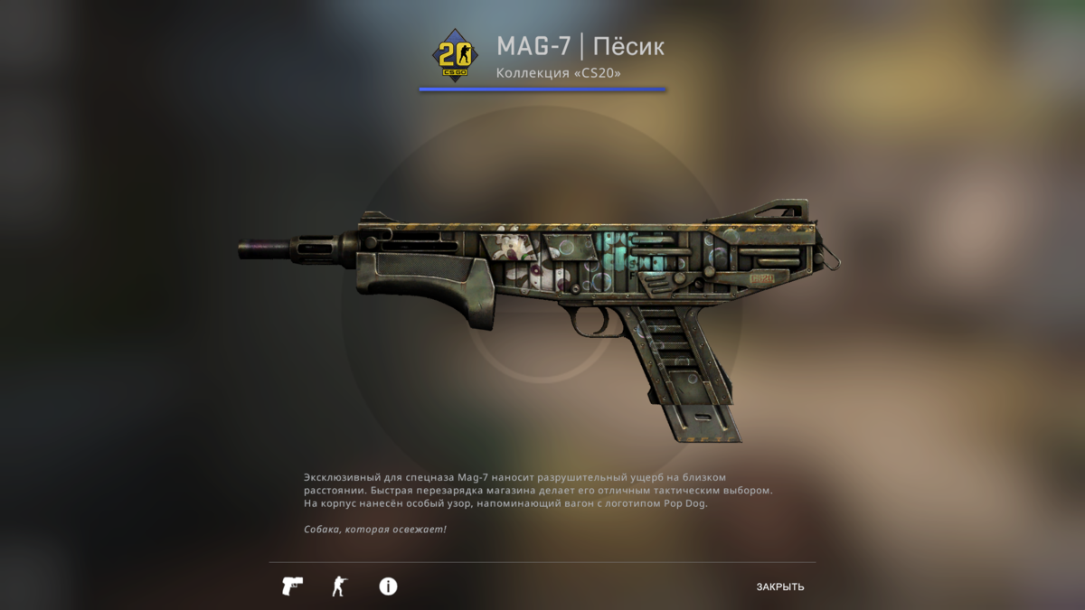 Все любят пёсиков, ну, я надеюсь. Вот Вам пёсик и в игре, не считая стикеров. Пиксель придерживается традиций кейса КС20, и выполнен в присущей данному кейсу стилистике.