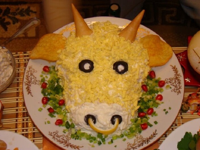 Всеми любимый и самый новогодний салат "Оливье" можно оформить в виде Быка - символа 2021 года. Отличное решение для тематического праздничного стола!