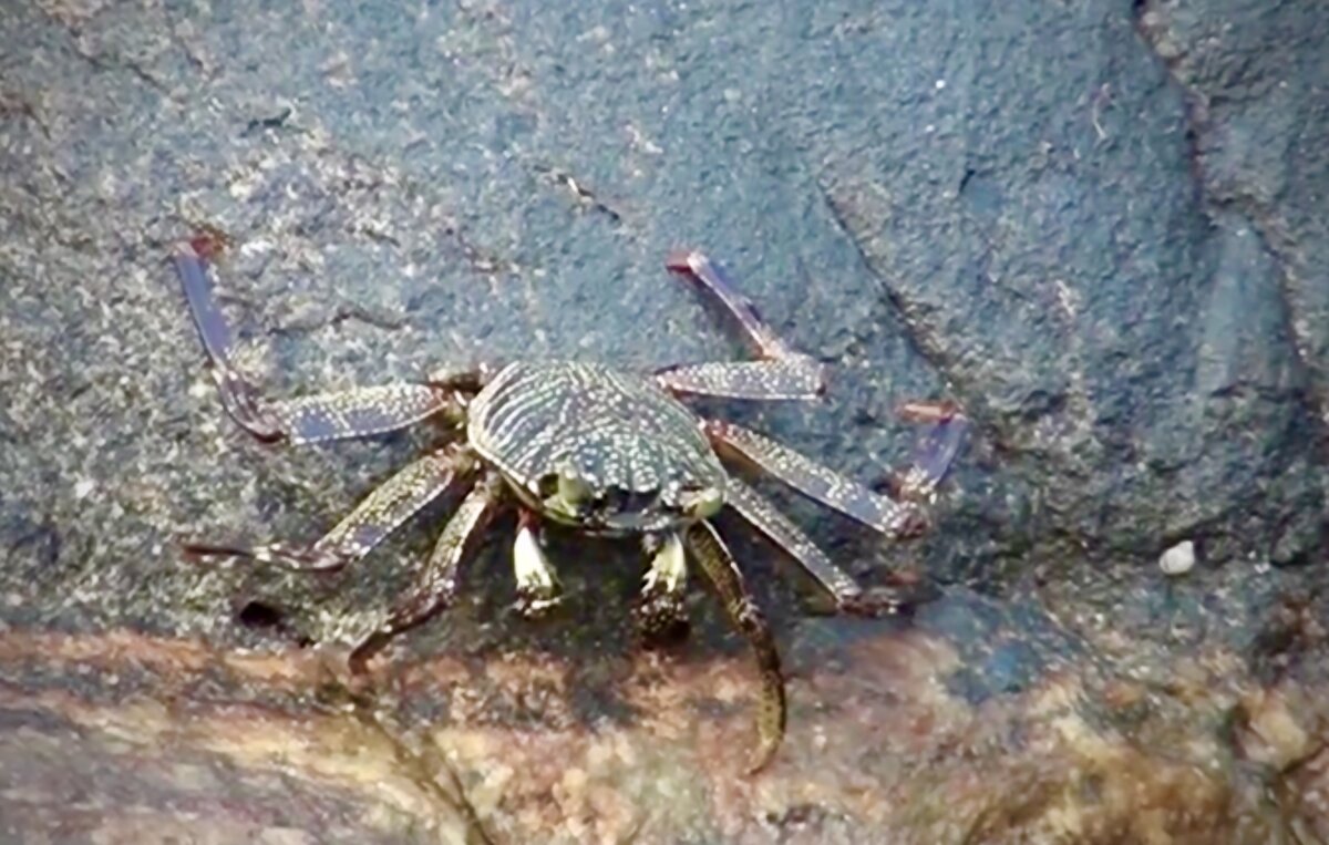 Обычно в отлив на эти камни выбираются погреться на солнышке небольшие тёмно-коричневые в мелкую крапинку крабы, которых тут в избытке.