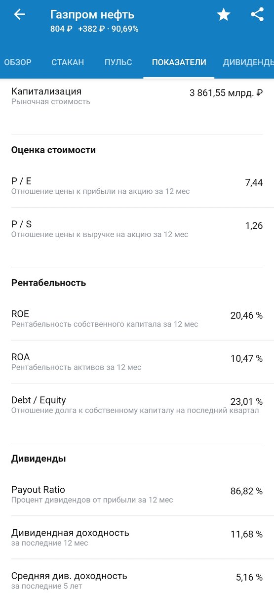 В одной из прошлых статей мы уже разбирались, что такое мультипликаторы и как они помогают анализировать компании перед покупкой акций (также ссылку продублирую в конце статьи). Сегодня предлагаю обратить внимание на одну из самых дивидендных акций российского рынка (по итогам 2023) и посмотреть как на данный момент выглядит ситуация по этим показателям у данной компании. Возможно, после этого краткого описания у вас возникнет желание побольше узнать о ней или наоборот не связываться😄. Речь идёт про Газпром нефть (тикер SIBN). Капитализация 3 861,55 млрд ₽ - крупная компания с большой и дорогой имущественной базой. Активно развивается и строит амбициозные планы на будущее. P/E=7,44 - это обозначает возможную недооцененность рынком и некоторый потенциал роста компании. Также факторы в подтверждение наличия потенциала роста: P/S=1.26 - неплохо, значит за предыдущие 12мес выручка (до налогов и прочего) составила чуть больше, чем 3000 млрд ₽. ROE = 20,46% - значит, что рентабельность со