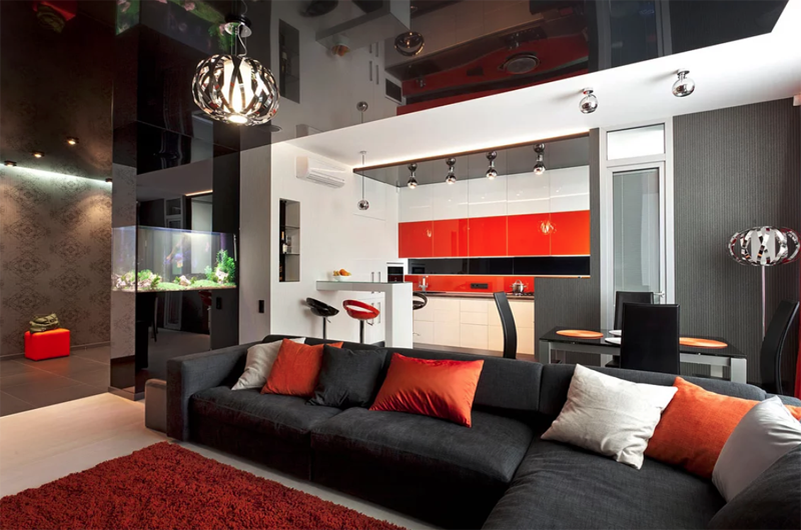 Меблировка в кухне, совмещенной с гостиной в стиле хай-тек, выступает броским акцентом: она имеет возможность быть красноватого,