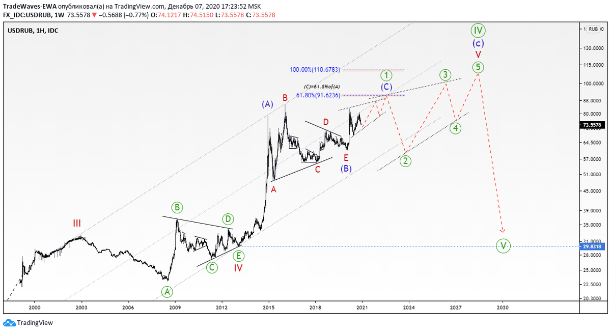 Предположение о том, что снижение идёт заключительной волной большого треугольника, с последующим выходом вверх, было выдвинуто ещё в декабре 2018 . Была спрогнозирована точка смены течения и характера социальных настроений, следствие которых каждый из нас ощутил на себе в той или иной мере. Цели не достигнуты, паттерн волн Эллиотта более старшей степени не сформирован, а значит, волна негативных социальных настроений будет продолжена и, как следствие, продолжение рыночной девальвации национальной валюты. В рамках пока ещё основного сценария, предлагаю рассмотреть вероятность усложнения волны V of (c) of ((IV)) до конечной диагонали, в рамках которой формируется диагональ (С) of ((1)).