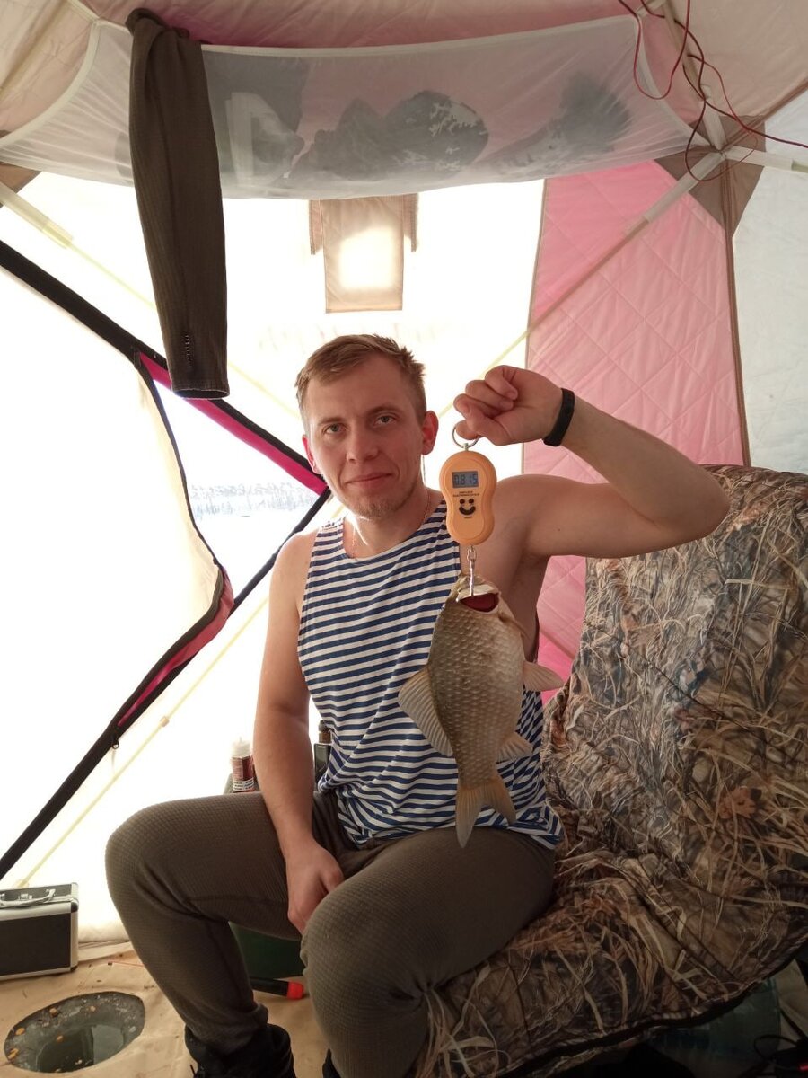 Дима своей рыболовной чуйкой нашел место, забурили, ребята одолжили косу, выкосив дно, мы стали раскладываться.