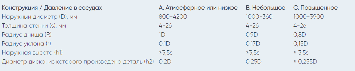 В зависимости от технических характеристик, условий эксплуатации емкостного оборудования и сосудов торосферические заглушки изготавливают в трех исполнениях: A, B, C. Первый применяют при низком давлении, второй ‒ при небольшом, третий ‒ при повышенном.