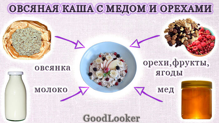 Овсяные хлопья следует залить молоком, можно использовать и воду. Варить до готовности, понадобится в среднем 6 минут. В остывшее блюдо добавить орехи и мед, можно также добавить фрукты, ягоды или сухофрукты. Овсяная каша отлично сочетается со свежевыжатым соком и травяным чаем. Указанного количества продуктов в рецепте пп завтрака достаточно для приготовления 1 порции каши.