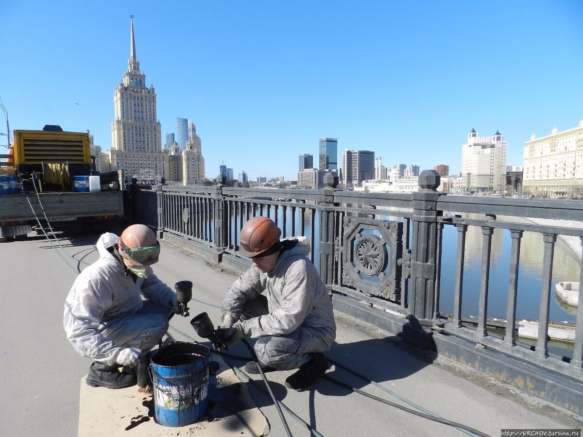 Посмотрев на памятник, спускаюсь на Смоленскую набережную, которая переходит в Краснопресненскую. Прохожу под Новоарбатским мостом. Его спроектировали ещё до войны, но строили с 1953 по 1957 годы. После открытия мост получил название Калининского, по названию проспекта, к которому он был присоединён в 1963 году после прокладки Нового Арбата. В 1993 году мост был переименован в Новоарбатский. Сверху открываются великолепные виды. Сам мост чистят и красят, готовя к летнему сезону. В старом советском фильме "Старик Хотабыч" 1956 г. Волька купается в реке и находит кувшин, из которого далее материализуется Хотабыч. На другой стороне реки можно видеть гостиницу Украина. Из этого следует, что кувшин лежал в реке рядом с Белым домом. Чуть в стороне в Б.Девяткинском переулке возле гостиницы Мир Фрунзик Мкртчан отдал Вахтангу Кикабидзе два балона резины для перепродажи, после чего действие фильма развернулось с ещё большим размахом.