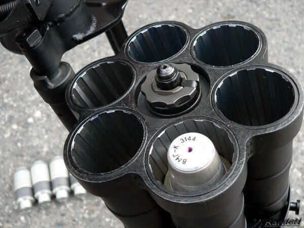 После выстрела спусковой крючок под действием своей пружины возвращается вперед, шептало с рычагом поворачиваются обратно, план-шайба освобождается, и блок стволов поворачивается на 1/6 оборота. Новый ствол готов к выстрелу. Таким образом, работа шептала и его рычага напоминает анкерное устройств часового механизма. Головка рычага шептала выступает с левой стороны корпуса, и, нажимая на нее, можно повернуть блок стволов без выстрела и подвести под курок нужный ствол. Это может понадобиться, например, когда гранатомет снаряжен выстрелами разных типов. Поворот столь массивной детали, конечно, вызывает заметное сотрясение оружия, но гранатомет не предназначен для скоростной стрельбы - этому не способствует уже энергия отдачи при выстреле.