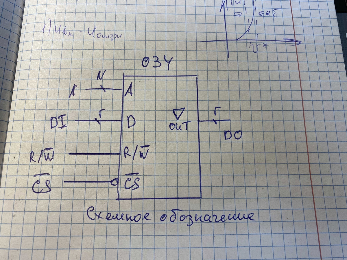 Если рассмотреть микросхему ОЗУ, то мы видим адресные входы A, вход данных DI, вход для синхронизирующего сигнала Read/Write, который задает операцию понятную из названия чтение/запись. Также есть вход выбора сигнала, который называется Chip Select ( активен низкий уровень).