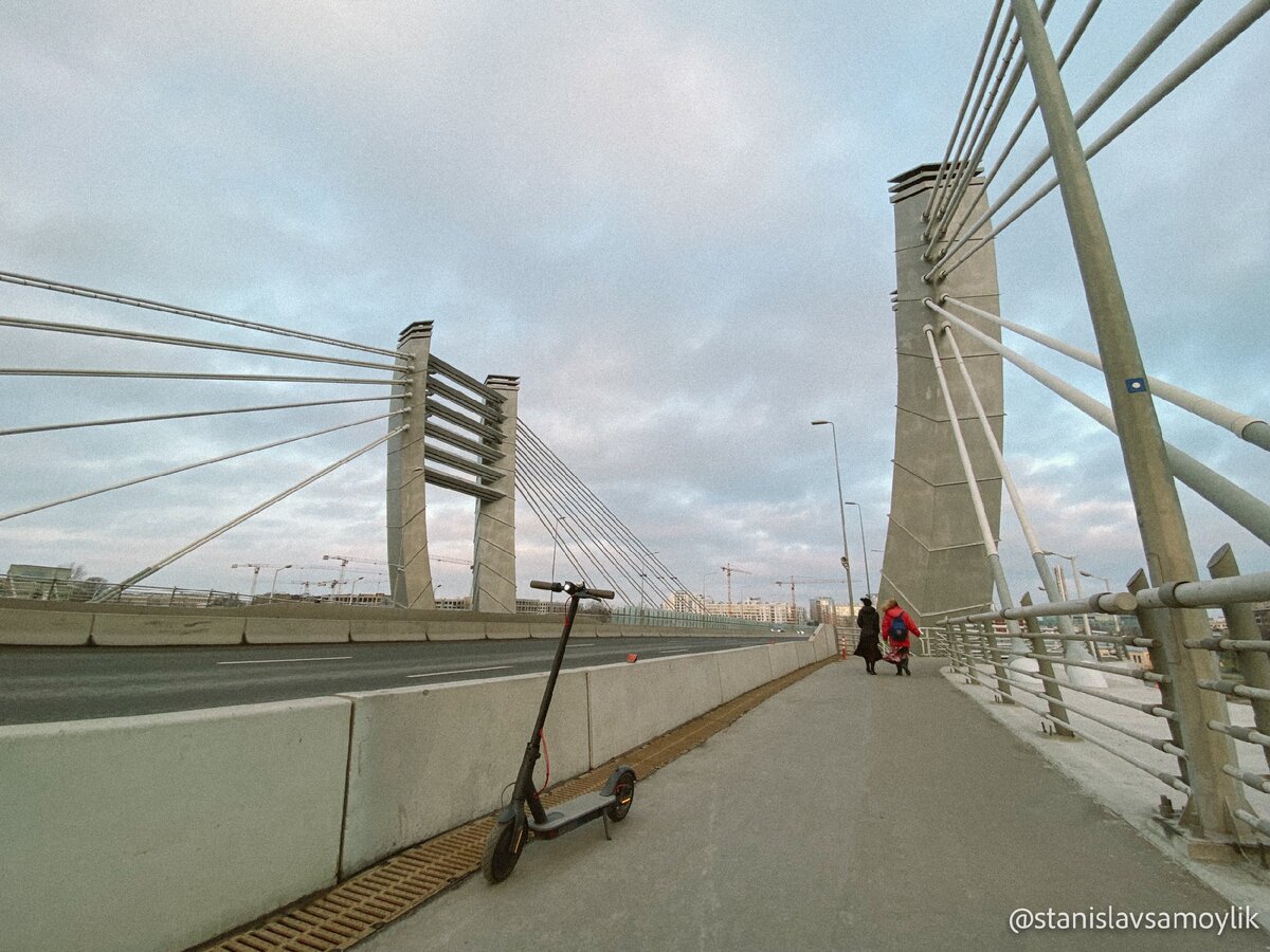 Я много раз видел этот мост со стороны, проезжал рядом, но никогда раньше не проезжал через него, сегодня была первая такая прогулка, ехал на самокате с Петроградской стороны на Васильевский остров. Так как поднялся на мост с Петровского проспекта, то сначала не заметил, что находится под мостом. И только на обратном пути, спустившись у самих опор моста, обнаружил новенький скейтпарк!