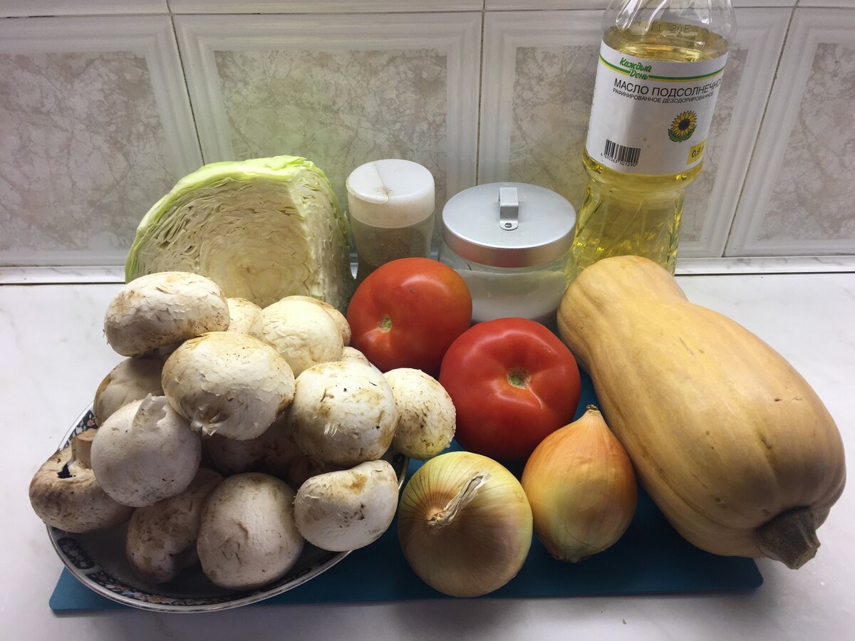Нам понадобятся: шампиньоны, помидоры, репчатый лук, тыква, капуста, соль, молотый чёрный перец и растительное масло.
