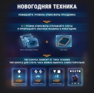 Слоты для новогодней техники можно заработать, повышая уровень атмосферы праздника. Первый слот вы получите при достижении V уровня атмосферы праздника. Затем вы будете получать по одному слоту за каждый новый уровень.