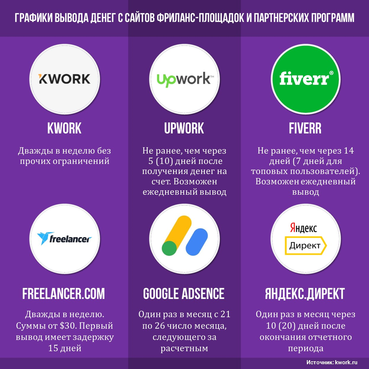 Оговоримся сразу: глубокой аналитики мы не проводили. Просто небольшое сравнение 6 интернет-ресурсов между собой. Наш небольшой ТОП-5: где подработать "текстовику" Как вы сами видите, КВОРК и freelancer - это два дня выплат в неделю. В первом случае, без ограничений. Правда, администрация КВОРК честно предупреждает о комиссии и рекомендует не выводить суммы меньше 858 рублей: Источник: kwork.ru upwork и fiverr говорят о возможности ежедневных выводов, но предупреждают о задержке от 5 до 14 дней. Вероятно, это связано с тем, что средства на вывод всегда подвергается проверке на безопасность. К тому же, есть вероятность, что недовольный клиент через трое суток после принятия заказа "вылупится" и начнет предъявлять претензии, а сервис деньги вам уже перевел. Таким образом сайты пытаются обезопасить себя и клиента. Ну, иногда и вас:) Яндекс и Гугл выводят деньги раз в месяц. Источник: https://www.freepik.com/free-photo Читайте по теме: Азбука копирайтера Из офиса - в свободное плавани
