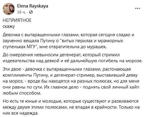 Комментаторы попытались взывать к гуманизму – мол, пожалейте художника, она случайно, это последствия ковида. Но творческая единица агрессивно и внятно продолжала стоять на своем: