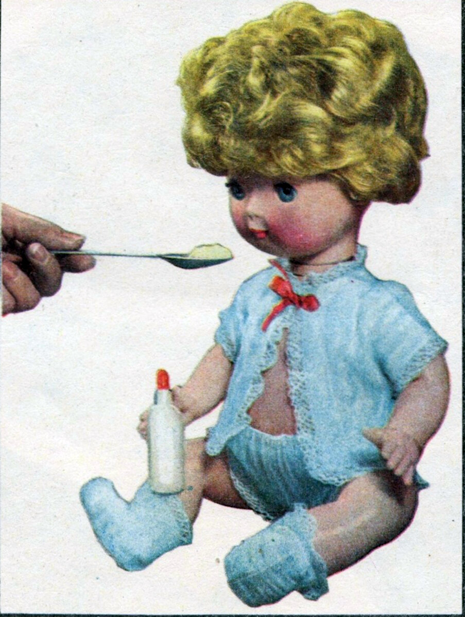 А ещё мне очень нравилась кукла "Непослушная Алёнка". Помните? Эта мне вообще казалось чудом техники))) Куклу в 1969-м году стала выпускать Московская фабрика художественных игрушек. Алёнка с удовольствием "пила" молоко из бутылочки, а от ложки с кашей отворачивалась. Выпускалась в разных костюмах, высота куклы 48 см. Если я бывала у кого-то в гостях, кто обладал таким счастьем, то всегда кормила Алёнку с удовольствием.