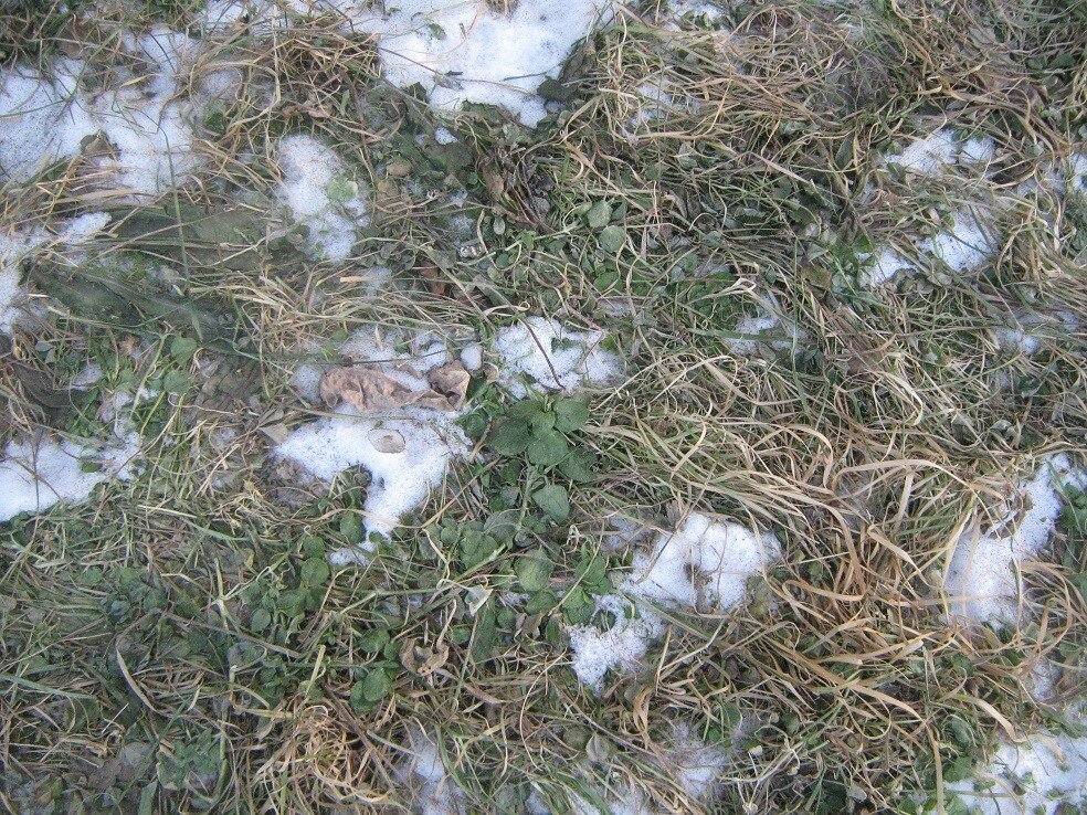 Тут, правда рядом многоквартирный дом с его теплыми коммунальными подземельями. Может, еще и это сказывается? Но чуть далее, возле дороги, где солнечные лучи пробиваются в незатененные пространства между домами, в старой бурой траве тоже проглядывают зеленые стебельки. Так что вполне возможно, что мы являемся очевидцами рождения нового времени года – «бабьей зимы».