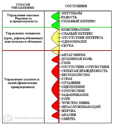 Объединение. Кто не испытывал радости от встречи с близкими после разлуки? Семья, дружба, любовь – это отсюда. Пример из жизни: в классе, обучающемся по курсу «Основы достатка семьи» есть команда танцоров – победителей одного из соревнований в Европе и девочка из этой команды, которая победила ещё и в индивидуальном зачёте. Разница в ощущениях от личной и командной победы, по её словам – очень заметна, с преимуществом в пользу команды. Сюда же: чемпионат мира по футболу, олимпиады, Новый год (хорошее настроение у большинства из нас именно потому, что у большинства хорошее настроение), День Победы, Крымская Весна (не для всех, и тем не менее). Важно: чувство/эмоция в дефиците, глобально.