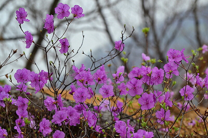 Подружки вскарабкались на полянку среди молодого дубняка. Вдалеке ярко цвел багульник.