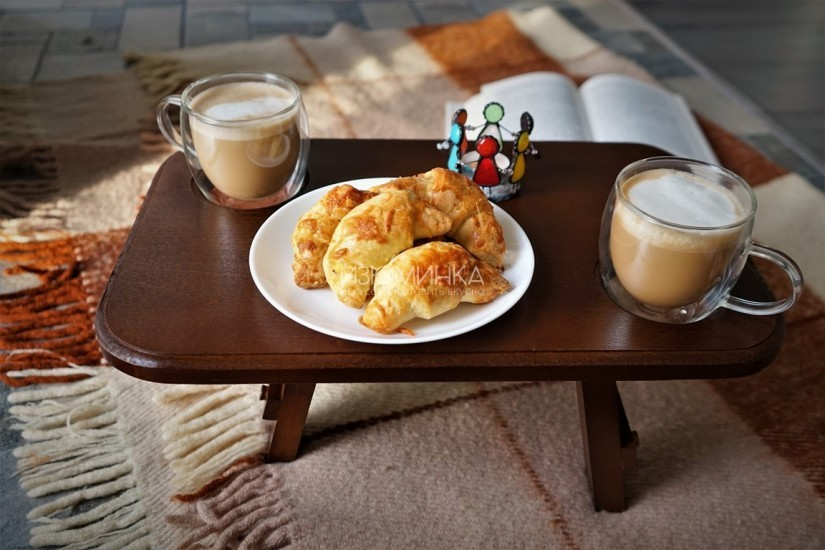 - Свернуть рогалики, начиная с широкой стороны. Чуть выгнув полумесяцем, выложить на противень, застеленный пергаментом для выпечки или силиконовым ковриком.