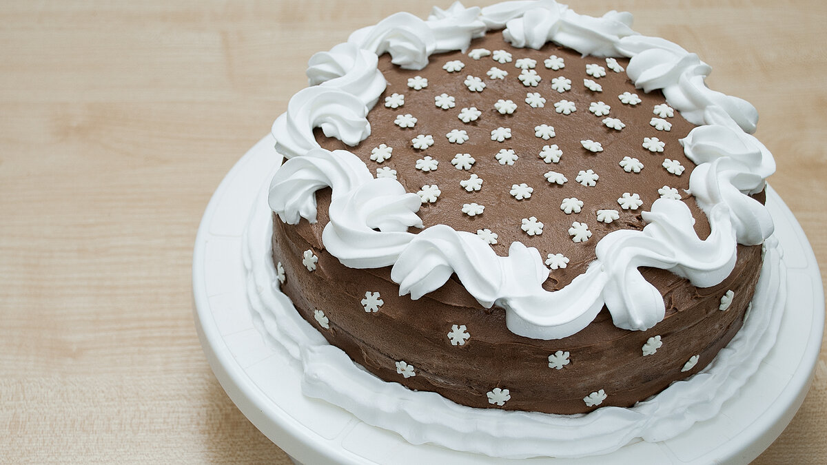 12. Верх и бока торта промазываем шоколадным кремом. Украшаем торт взбитыми сливками и кондитерской посыпкой. Убираем в холодильник на 3-4 часа