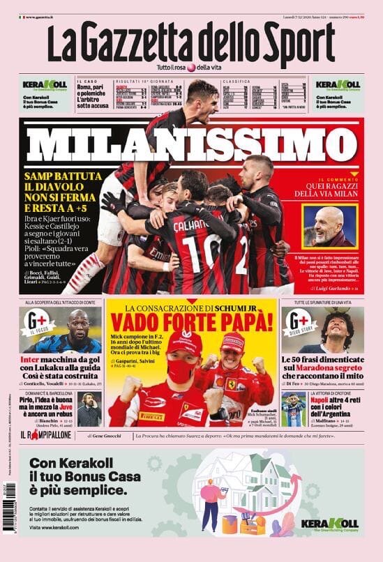 Победа «Милана» над «Сампдорией» и сохранение отрыва, разгром «Кротоне» от «Наполи», а также спорная ничья «Ромы» и «Сассуоло» – в утреннем обзоре заголовков итальянских спортивных изданий в блоге «В гостях у Кальчо».