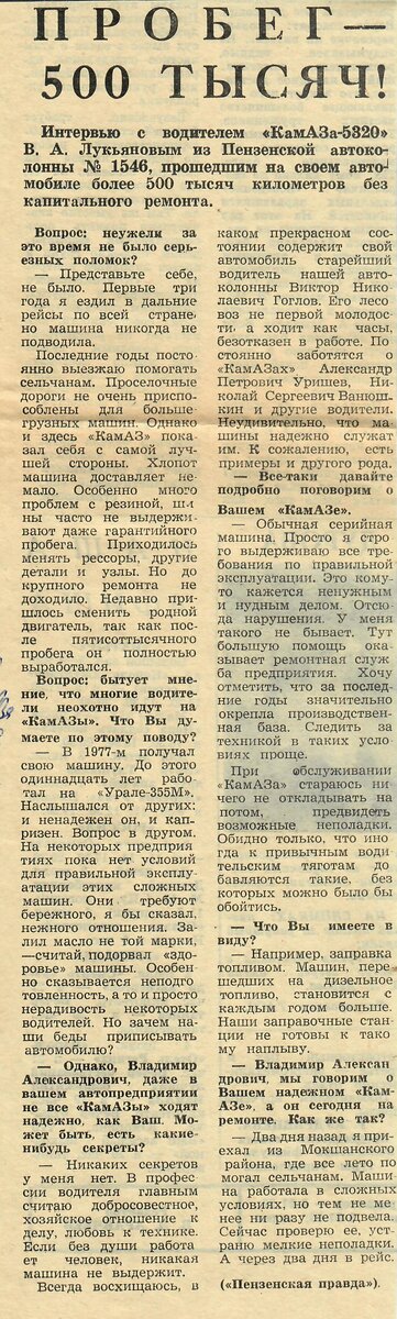 Внизу интервью с Лукьяновым В.А. – водителем автомобиля КАМАЗ-5320 из Пензенской автоколонны №1546.Интервью было опубликовано в газете «Рабочий КАМАЗа» от 2 августа 1984 года.