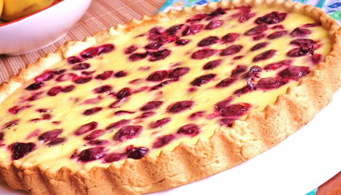 9.Выпекаем пирог с вишней в сметанной заливке в духовке при 180 градусах примерно 40 минут, пока начинка не "схватится".