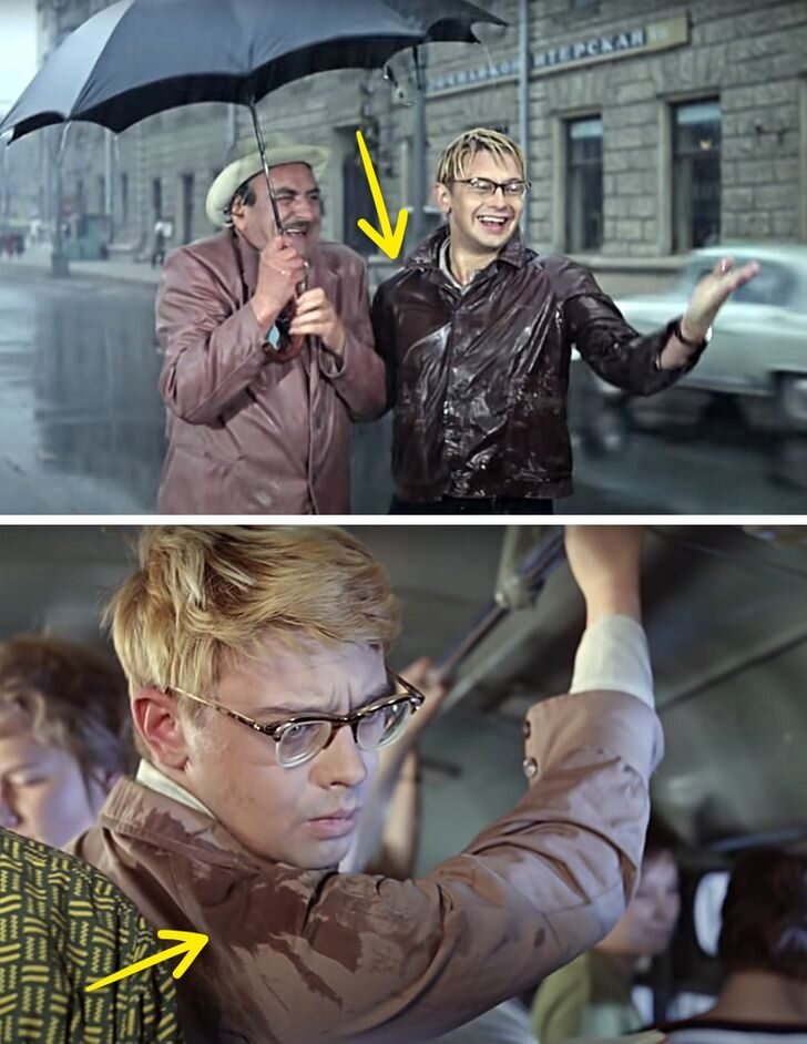 Шурик попадает под сильный дождь. На кадре сверху видно, что вся его одежда промокла. Однако через минуту, когда он садится в автобус, его куртка уже практически сухая (внизу).