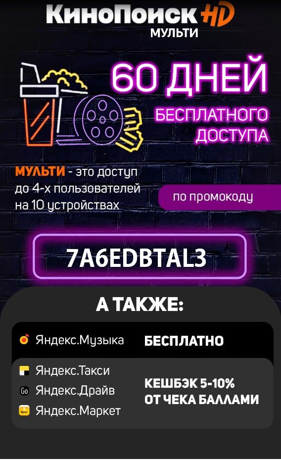 Получаем 60 дней бесплатного доступа к подписке Кинопоиск HD Мульти