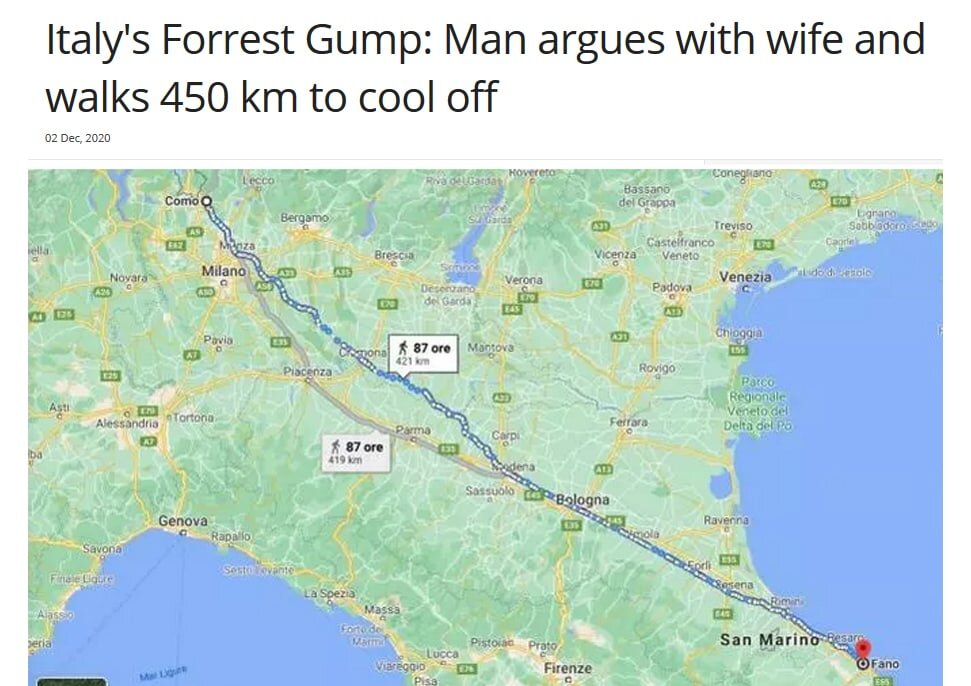 Итальянец вышел прогуляться, чтобы остыть после ссоры с женой, и прошел 450 км.