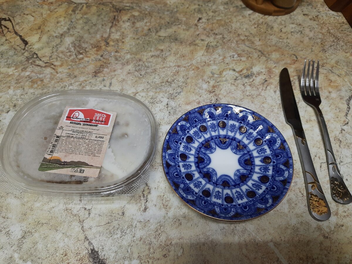 Буквально недавно в нашем "Светофоре" в продаже появился готовый холодец "Домашний". Цена конечно тоже низкая, всего 54 рубля за 450 грамм, что не мешало покупателям набирать по 2-3 коробки этого изделия. Посмотрев дату изготовления, я решила взять на пробу это готовое блюдо, а заодно поделиться с вами моими впечатлениями.