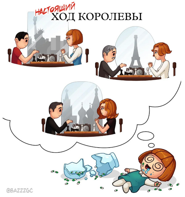 P.S. От себя добавлю, что подобная трактовка выглядит намного интереснее, чем банальнейший финал, где Бет обыгрывает советского чемпиона, но объективно является скорее домыслом автора, чем тайной задумкой режиссера. Финал "Хода королевы" многим показался слишком скучным, вот фанаты и ищут тайный смысл там, где его нет...
