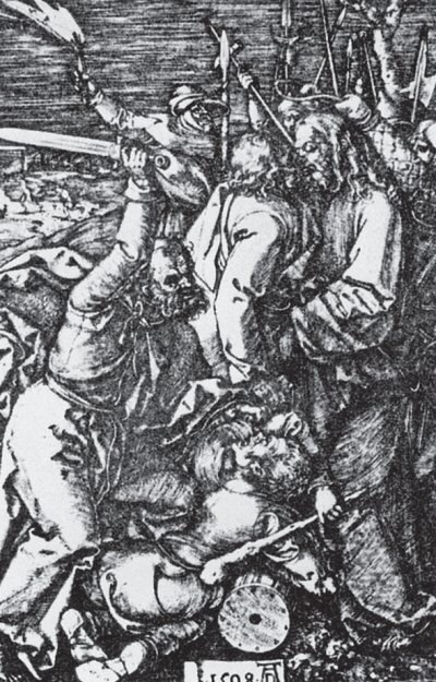 Гравюра А. Дюрера на тему «Арест Исуса». Иуда целует Христа, а Петр наносит размашистый удар мечом… Исусу.