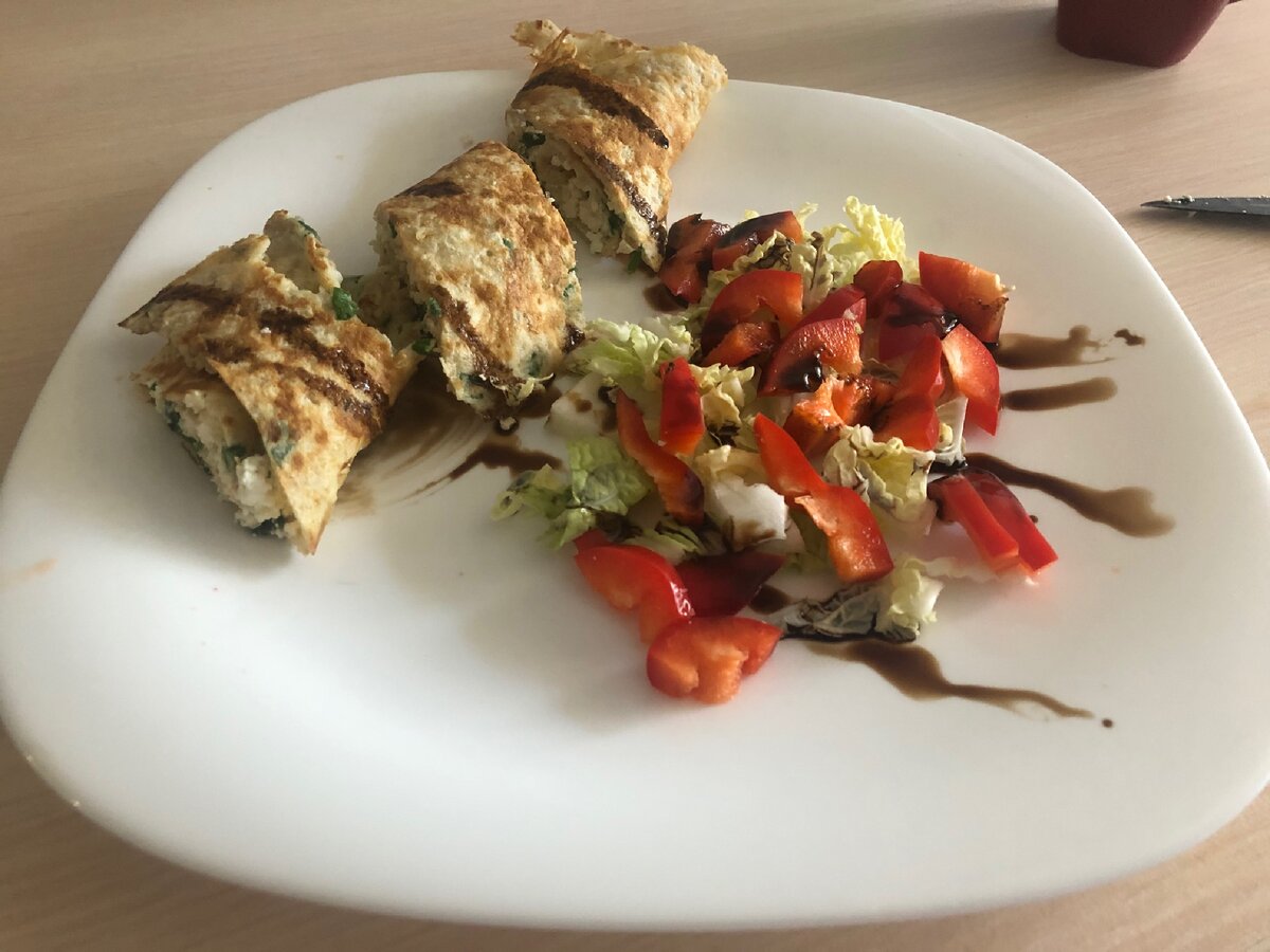 Далее готовую начинку помещаем внутрь блина, и делаем рулетик или складываем пополам. Для подачи можно разрезать на порционные кусочки.