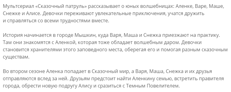 «Сказочный патруль» — российский анимационный детский мультсериал студии «Паровоз». Повествует о приключениях четырёх девочек-волшебниц, приехавших в город Мышкин.