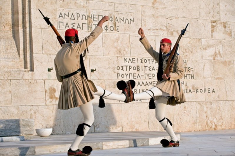 Обычно почётный караул это важнейший отряд на который должны ровняться остальные солдаты, понимая какую почетную и важную службу они выполняют. Но вот грекам почему-то приглянулась именно такая форма, напоминающая что-то клоунско-птичье (как по мне смахивают на индюков).