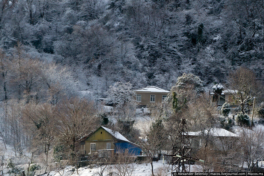 Выехав из бесснежного Сочи, я был очень удивлён, когда по дороге встретил совершенно заснеженные пейзажи.Понятно, что горы, но для юга такие снега всё же удивительны, это редкость.Я уже было пожалел, что поехал сюда, я ненавижу снег, а в Сочи мог бы денёк без него прожить.Подумал и успокоился, зато у меня будут редкие кадры снежного Сухуми.Дорога до столицы то понижается до уровня моря, то поднимается на несколько сотен метров вверх. У моря снег пропадал, в горах снова появлялся.Между этим и следующим кадром всего десять километров пути.Увы, посмотреть Сухум в снегу не получилось, там была ранняя весна с лужами и капелью.На первый взгляд ничего не помеялось, все эти огромные прекрасные заброшки как стояли так и стоят.На улицах продают одежду.В тот день я не хотел просто гулять по городу, а искал "героя", про которого можно было бы сделать интересный репортаж. Поэтому я решил заглянуть в Союзжур Абхазии, вот и здание подвернулось. Зашёл внутрь, а там - шахматный клуб. Только открыл дверь, преподаватель посмотрел на меня: "Пресс-клуба здесь нет. Где - не знаю. Хоть бы уже сняли эту табличку". Знал бы он, как бы я хотел забрать ненужную табличку с собой. Но увы, был пешком.Поэтому я всё-таки просто гулял по городу.Выпил кофе на знаменитой Брехаловке.- Вам в одноразовой посуде или нормальной?- Да я хотел взять кофе и на пирс пойти, давайте одноразовую.- Нэт, дарагой, бэри стакан, иди на морэ, потом принэсёшь.На Брехаловке, как всегда, многолюдно. Играют во всевозможные настольные игры.Корабль, про который я когда-то делал репортаж, по-прежнему стоит на месте. Только ещё больше ушёл под воду, теперь туда залезть не так просто.Уже ближе к вечеру я нашёл ту самую шашлычную, где мы обедали вместе с таксистом Сако в 2010-м году. Да-да, ту самую, где дешёвый и вкуснейший шашлык, потрясающий сухумский лимонад…после обеда решил поблагодарить повара, а заодно и сфотографировать его на память.- Ты не фотографируй меня, я пьяный!- Ну и что, зато усатый!- Ладно, давай один раз сфоткай. Потому что шашлычник всегда должен быть пьяным и усатым. Когда я трезвый - невкусно получается!Понимание, что такое Абхазия складывается из маленьких кусочков паззла, каких-то крошечных мгновений и случаев.