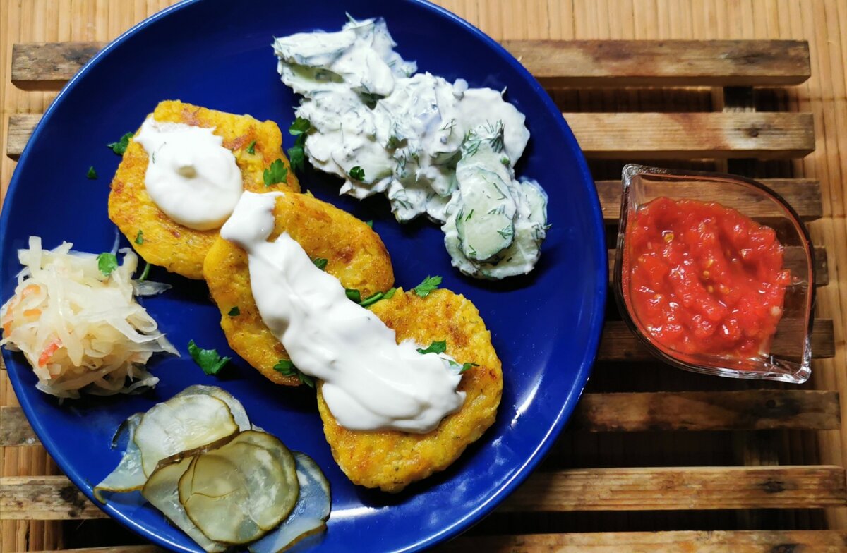 Обжариваем с двух сторон на небольшом количестве масла, огонь не делайте большим, буквально по паре минут с каждой стороны (продукт то уже готовый, по сути), до румяности. Выкладываем на тарелку, подаем со сметаной, огуречным салатом, соус любой, который вам нравится. Не лишним тут будет немного квашеной капусты и тонко порезанного соленого огурчика. Котлетки получаются нежными, таят во рту. Приятного аппетита!