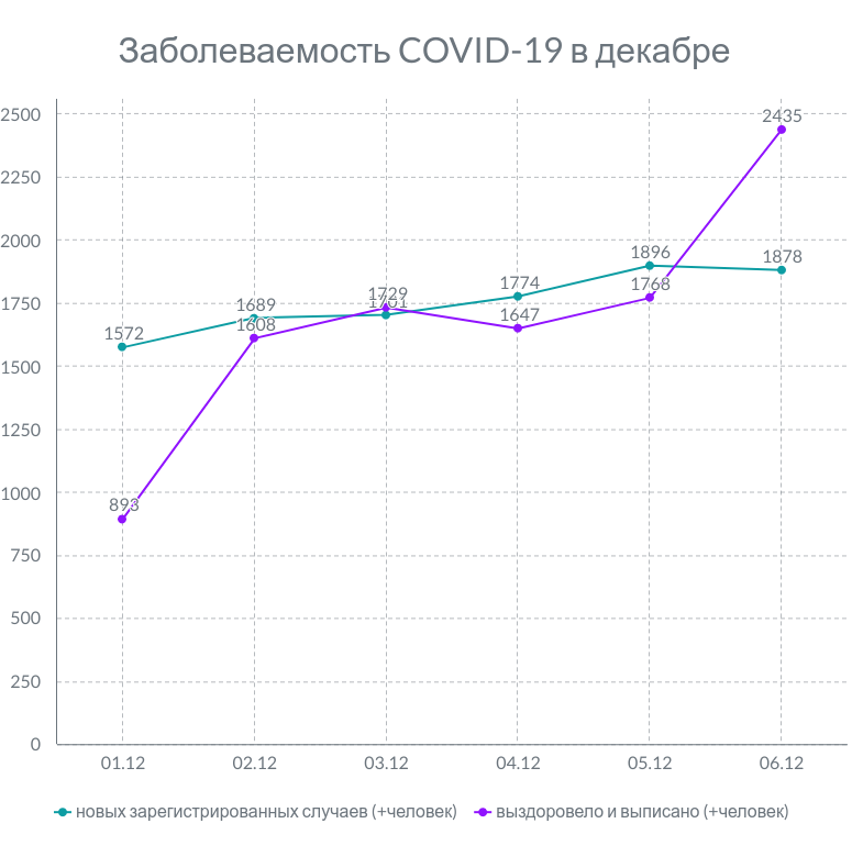 В начале декабря число зарегистрированных пациентов с COVID-19 достигло почти 1900 человек за сутки. Такую цифру Минздрав озвучил на 5 декабря, в субботу. С 1 декабря изменилась структура официальной статистики: с этого дня ежедневно публикуется не только общее количество заболевших и выздоровевших с начала эпидемии, но и число зарегистрированных случаев коронавируса и выздоровевших за сутки. Также стали публиковать, сколько тестов на коронавирус было сделано за сутки. Раньше давалась только общая цифра за все время эпидемии.