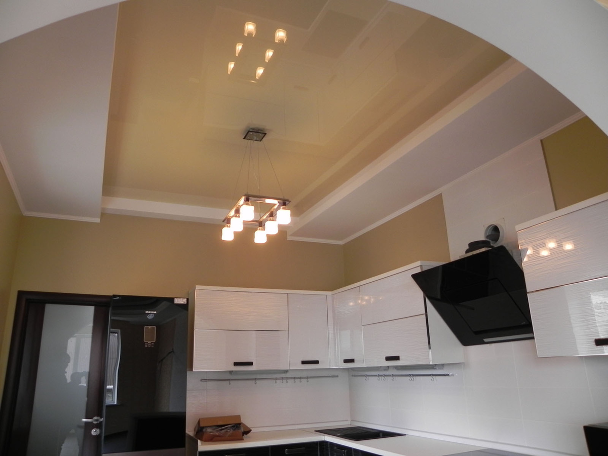 Ведь в подвесном потолке есть пространство, которое может стать местом размещения проводов, вытяжных труб, водопроводных или каких-либо еще. Такой потолок очень хорошо очищается от гари, жировых пятен, потому что его можно мыть чистящим средством и мокрой тряпкой. Но это можно в том случае, если он металлический, а не гипсовый. Как правило, на кухню потолки из поливинилхлорида (натяжные) не устанавливают. Они будут быстро загрязняться, особенно в летний период времени. Наиболее целесообразно будет установить в кухонном помещении потолок, сделанный на основе пластика. Они недорогие, их монтаж совершается в течение одного дня. Пластик очень легко чистится, он не боится воды и чистящих средств. Под него можно также спрятать все коммуникации, и он не менее красив подвесного. Все равно, для того, чтобы поверхность потолка оставалась чистой более длительный промежуток времени, необходимо установить вытяжку. А если еще в потолок монтировать несколько ламп, то вид будет великолепным и оригинальным.
