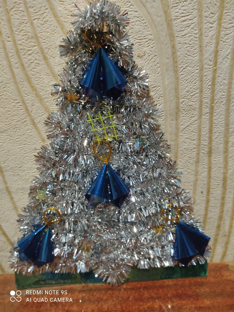 Просто на картоне вырезаем треугольник. Обклеиааем его дождичком и украшаем декором по желанию.