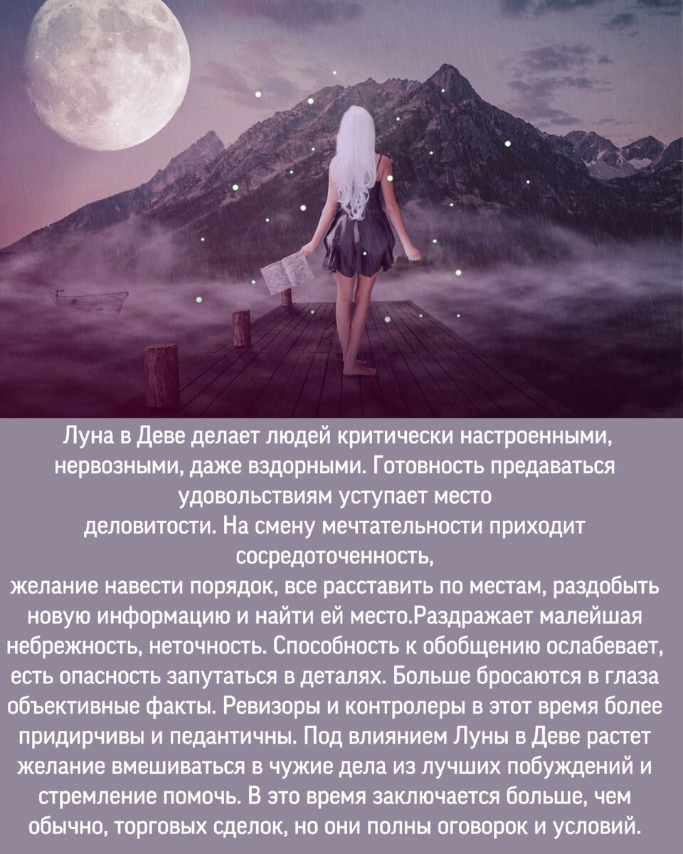 После яркого, насыщенного событиями Львиного влияния на ночное светило, транзитная Луна в Деве возвращает человека с небес на землю. Потратившие много сил на укрепление престижа личности и бизнеса почувствуют опустошение и депрессию. На первый план выходит рутинная работа, возникают бытовые проблемы, решение которых постепенно затягивает, вынуждая критично относится к себе и сотрудникам,